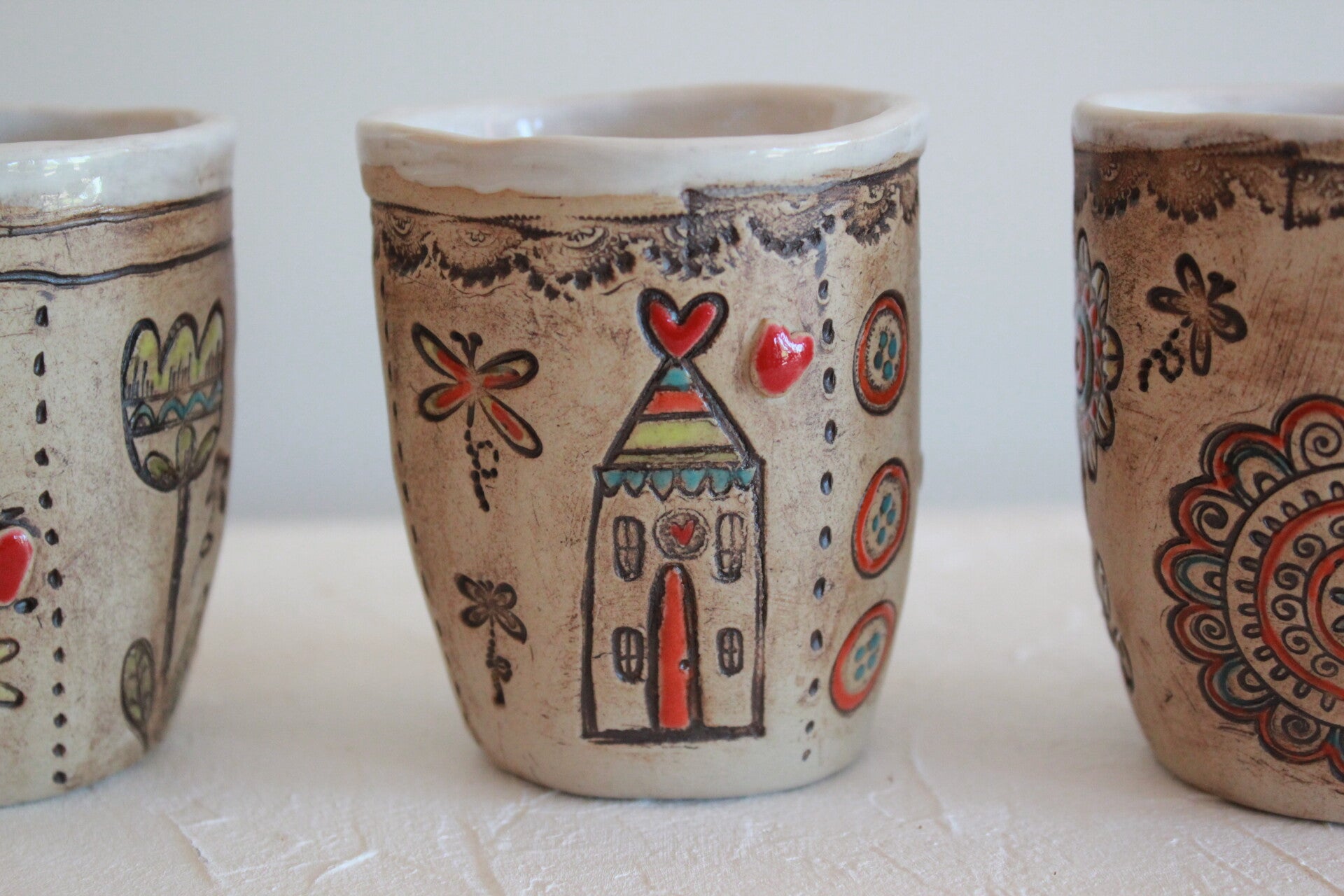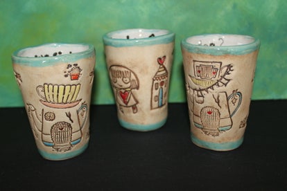 Leuke vrolijke bekers. Met een gezellige tekst. "Hoe was je dag?"Gemaakt van witte klei en bewerkt met vrolijke afbeeldingen. De afbeeldingen zijn ingekleurd met verschillende kleuren glazuur. Alle drie uniek en met de hand gemaakt.